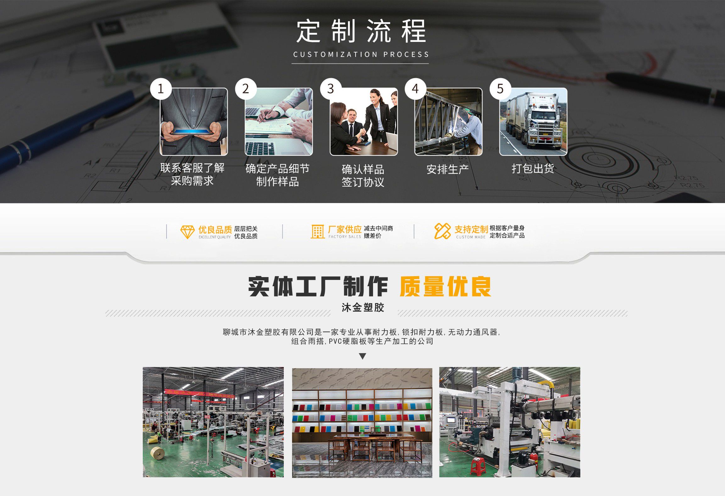 聊城市沐金塑膠有限公司注冊(cè)資金2180萬(wàn)元,占地20000余平方,擁有自建廠房15000平方,員工100余名。10余年來(lái),公司主營(yíng)耐力板,鎖扣耐力板,耐力板深加工,無(wú)動(dòng)力通風(fēng)器,組合雨搭,PVC硬脂板,耐力板廠家等板材的發(fā)展戰(zhàn)略,逐漸成長(zhǎng)為綜合性企業(yè)。 公司擁有多條板材共擠生產(chǎn)線(xiàn),采用世界知名品牌進(jìn)口原材料和先進(jìn)工藝,依據(jù)完善的ISO9001質(zhì)量管理體系和ISO14001環(huán)境管理體系,為產(chǎn)品的卓越品質(zhì)提供了強(qiáng)有力的保證。憑借過(guò)硬的創(chuàng)新能力和堅(jiān)實(shí)的硬件基礎(chǔ),贏創(chuàng)已成為國(guó)內(nèi)領(lǐng)先的熱塑性板材生產(chǎn)商,產(chǎn)品被廣泛應(yīng)用于建筑業(yè)、農(nóng)業(yè)、工業(yè)、廣告業(yè)、安防行業(yè)及DIY領(lǐng)域。 公司始終致力于通過(guò)提供最優(yōu)的板材應(yīng)用解決方案,為客戶(hù)創(chuàng)造最高的價(jià)值;堅(jiān)守創(chuàng)新、質(zhì)量、靈活、服務(wù)和速度的核心價(jià)值觀;堅(jiān)持“完美的產(chǎn)品需要完美服務(wù)的支持”的經(jīng)營(yíng)理念,努力實(shí)現(xiàn)成為世界領(lǐng)先的板材與解決方案供應(yīng)商的夢(mèng)想。 在未來(lái),公司將立足客戶(hù)需求,不斷改變和完善現(xiàn)有產(chǎn)品,拓展產(chǎn)品線(xiàn)和充分開(kāi)發(fā)板材的應(yīng)用領(lǐng)域,為客戶(hù)創(chuàng)造全方位的價(jià)值。同時(shí)更好地實(shí)現(xiàn)員工的價(jià)值,實(shí)現(xiàn)公司團(tuán)隊(duì)的價(jià)值。我們將與您一起創(chuàng)贏未來(lái)! 企業(yè)使命:成為世界領(lǐng)先的板材與解決方案供應(yīng)商。 公司愿景:通過(guò)提供最優(yōu)的板材應(yīng)用解決方案,為客戶(hù)創(chuàng)造最高的價(jià)值。 核心價(jià)值觀:質(zhì)量...